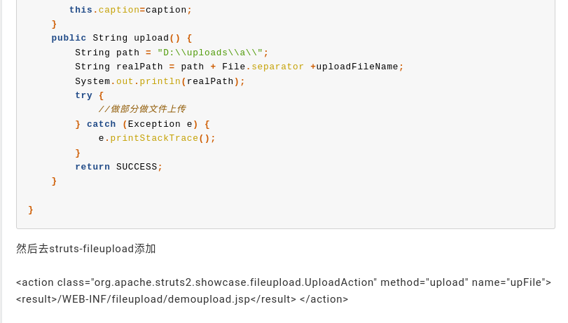 They provide the source code for how they implemented that mimicking a real business use case. And then finally, in the struts file upload XML based definition, they define an action class for uploadAction with a method of upload, a name of upFile, and finally registering the path for that content at the. Route for demo.