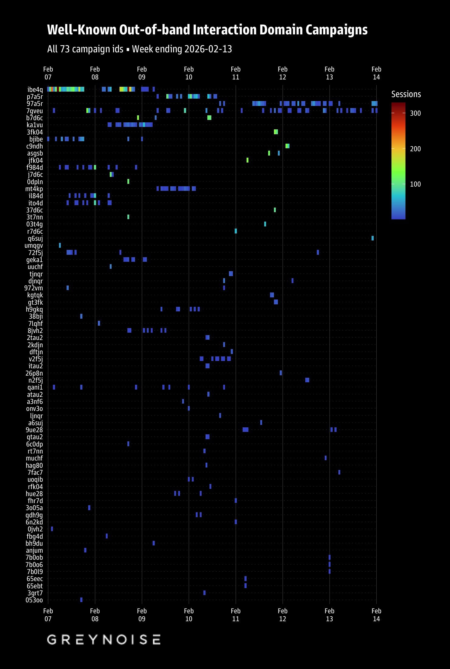 A single IP, 179.43.146.42 (AS51852, Private Layer INC, Switzerland), generated 511 OAST domains across 456 sessions in campaign 7gveu, active throughout the entire observation window (Feb 7-13). GreyNoise first observed this IP on 2026-02-03 (43,110 hits across 38 sensors). The sustained, continuous scanning pattern across 7 days suggests automated, unattended operation. All six injection vectors were used.
