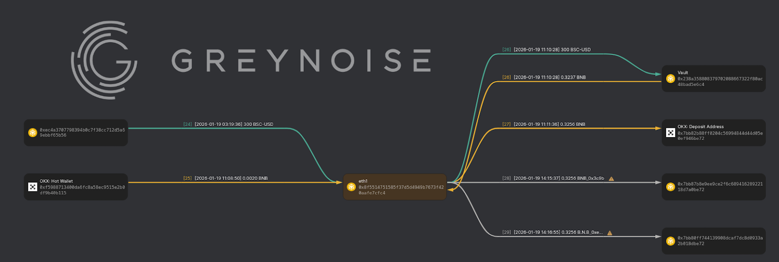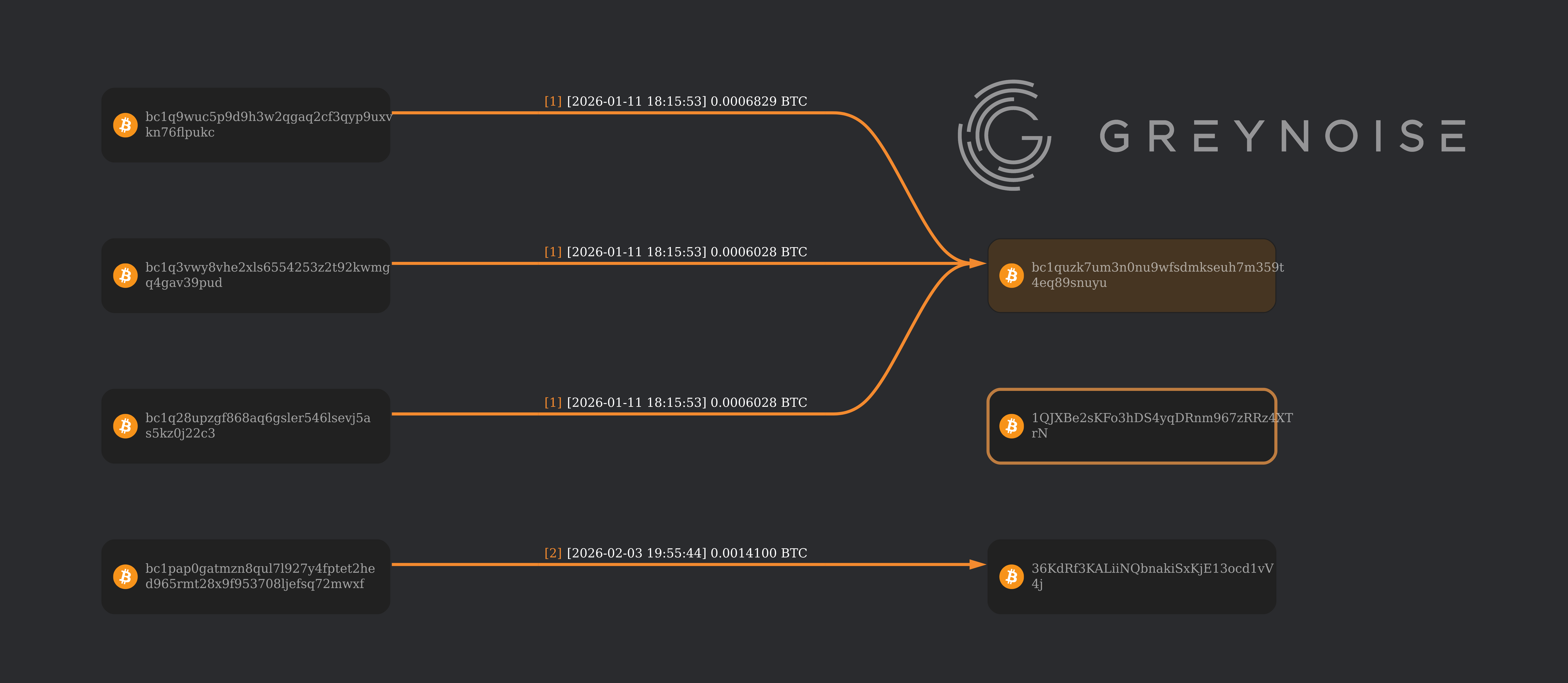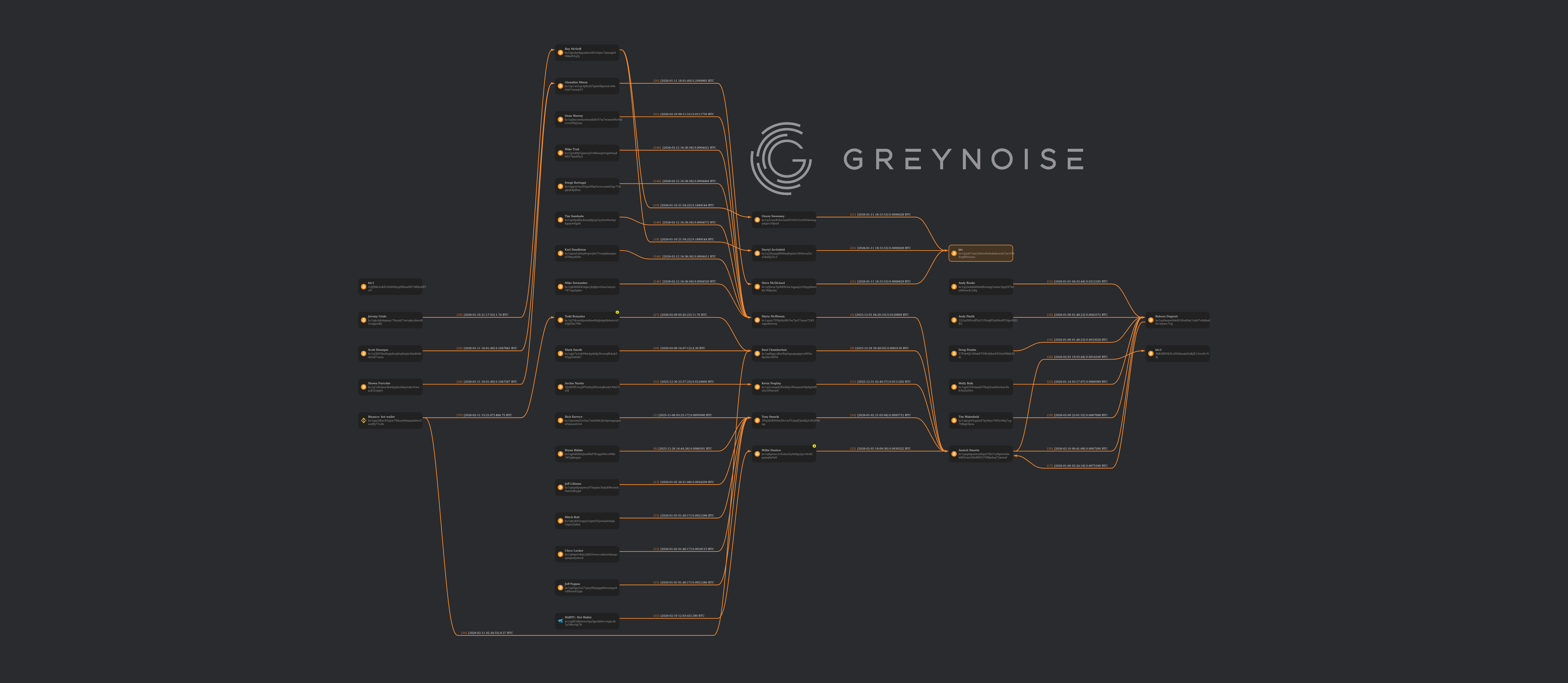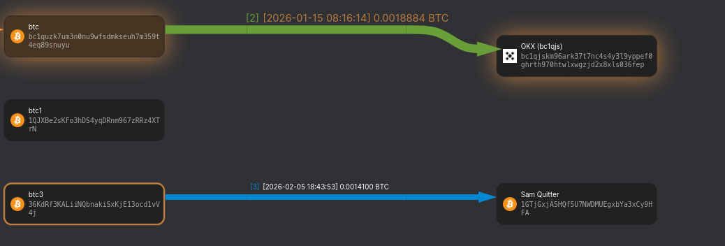 Btc and btc 3 each send about 150 bucks to the OKX crypto exchange and Sam Quitter, respectively. Again, no activity from btc1, which makes me suspect a cold wallet.