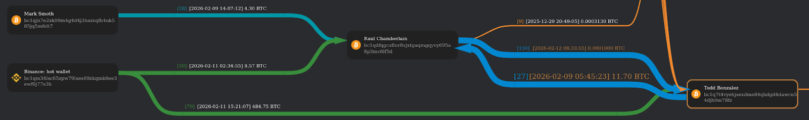 Later that same day, Mark Smoth sends 4.30 bitcoin to Raul, which amounts to about $306,890.87. Three days later, Raul sends Todd 0.0001000 BTC, or about 7 bucks.