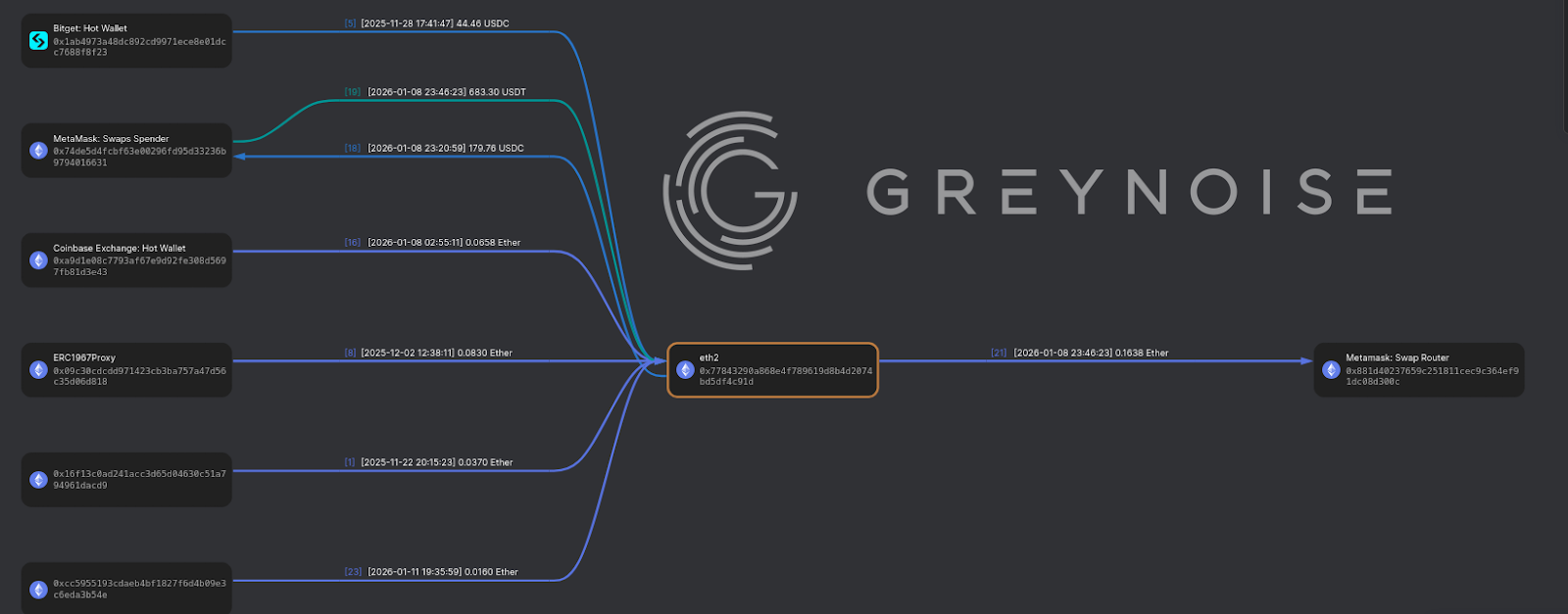 They buy a little over $1000 worth of USDcoin, USD Tether and Ethereum, mostly from exchanges or swap wallets (basically a way to try and avoid “gas”, or process fees, through direct trading) before sending a tidy package of about $300 worth of ethereum to the metamask swap router. Metamask is a popular wallet, but also super popular among scammers because it has a reputation for less experienced users and less strict security measures. Metamask was the wallet of choice among NFT-stealing scams during that weird period.